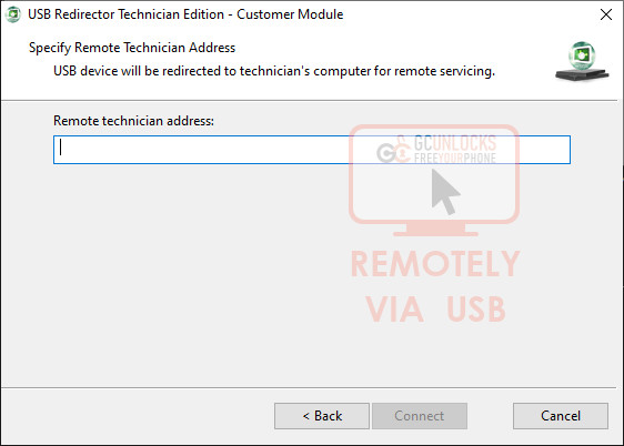 Step 3 - Once you connect to our technician address you will see the message displayed on the left. At this point, you will need an original USB Cable to connect your phone to the computer. Please use main branch USB Cables such as Samsung, LG or the one that originally came with the device.